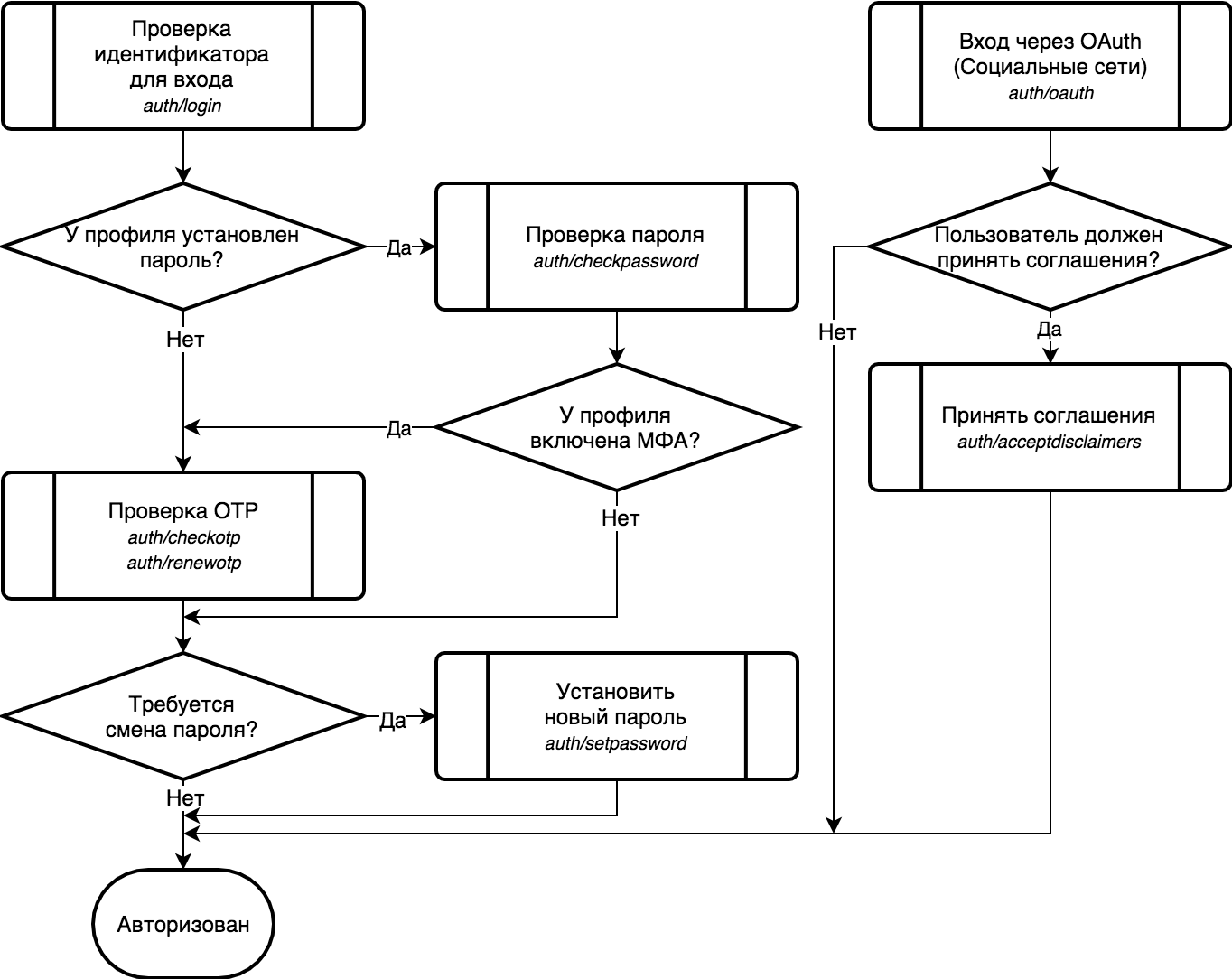 Во время проверки пароля или OTP пользователь также должен принять соглашения, если это требуется. Отдельный вызов auth/acceptdisclaimers используется только при входе через OAuth.